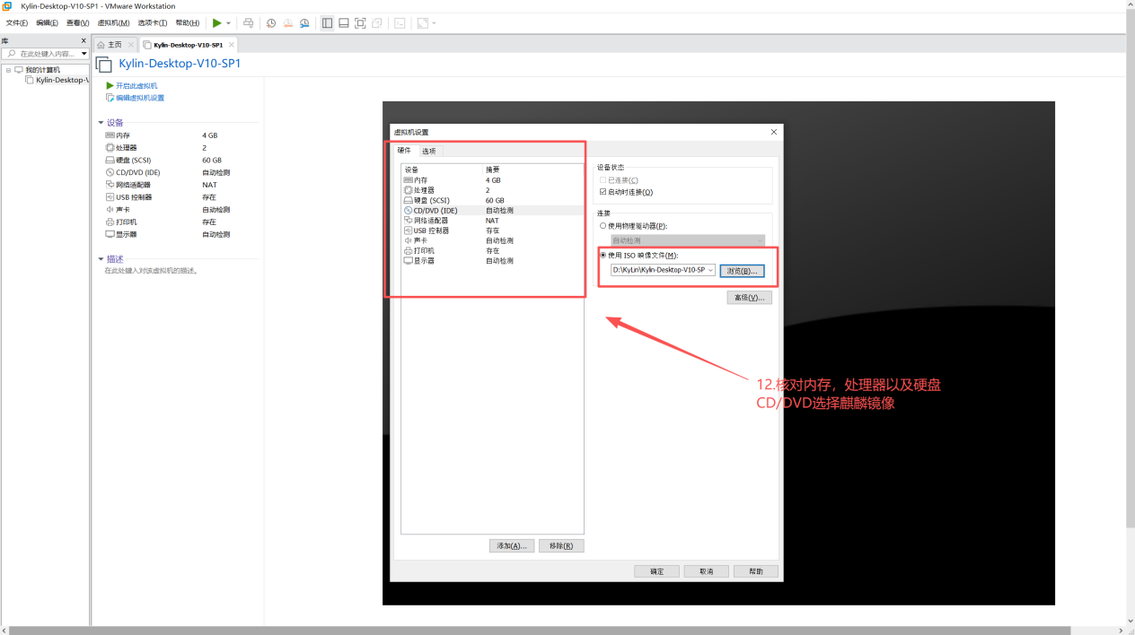 CD/DVD 需要挂载麒麟 ISO,保证虚拟机可以从镜像启动。