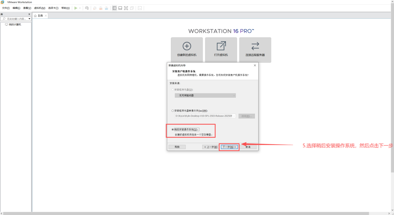 后,在主页点击"创建新的虚拟机"。这是安装麒麟系统的入口,会进入新建虚拟机向导。