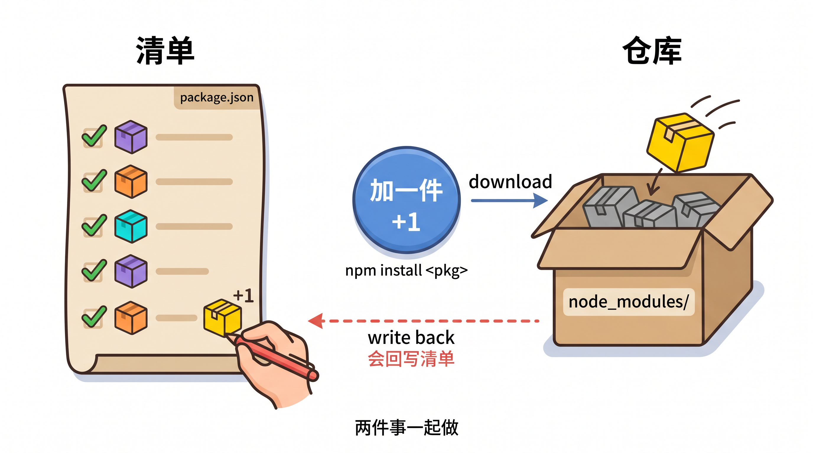 它会把清单上的所有依赖全部下载下来。读 package.json 里所有 dependencies + devDependencies,全部下载到 node_modules/ 里。