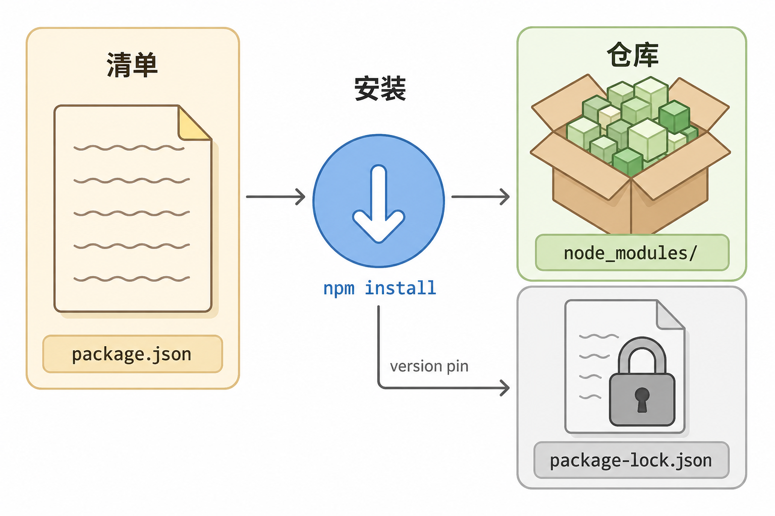 其中,左边的 package.json 是你写的清单,告诉 npm 要装什么。中间 npm install 是动作。右边是结果,node_modules/ 是真正下载下来的代码,package-lock.json 记录每个包的精确版本号,保证你和同事装出来的依赖一模一样。三者中只有 package.json 和 package-lock.json 可以放到git ,node_modules/ 永远不要放进去。