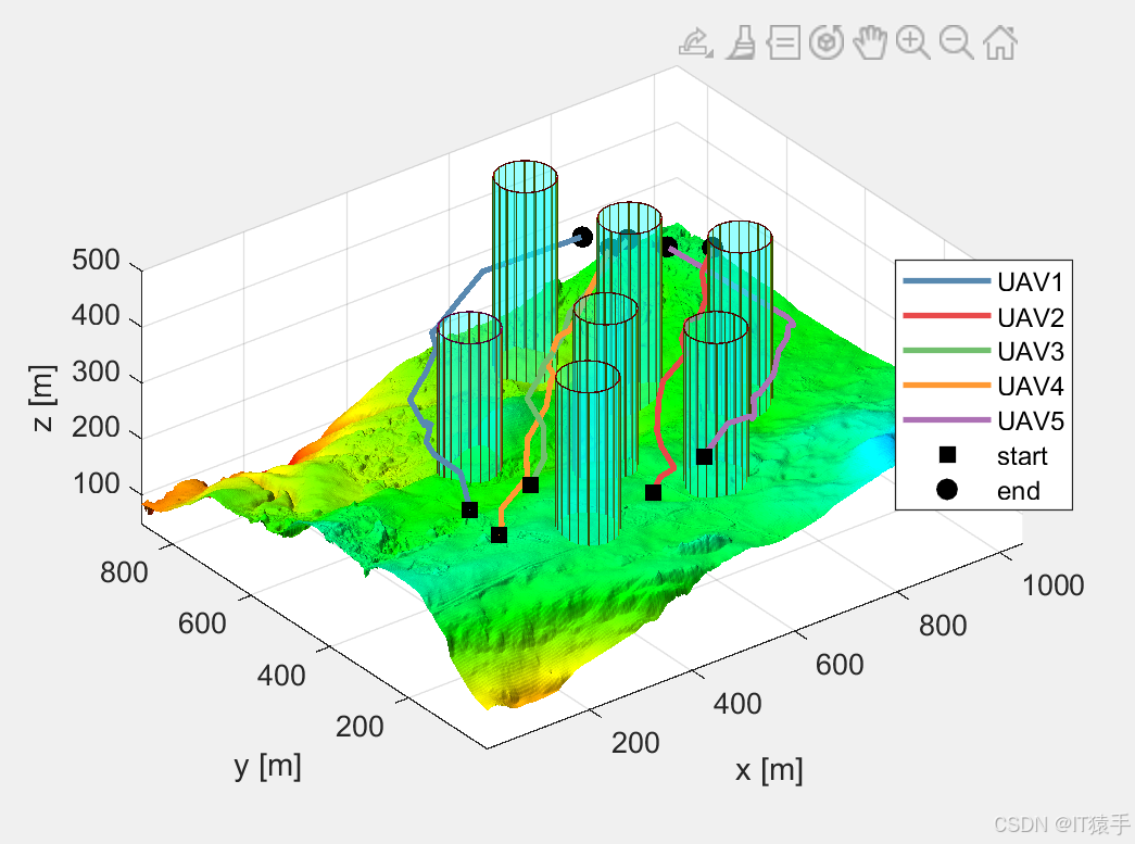 在三维无人机路径规划中,无人机的路径由起点,终点以及起始点间的点共同连接而成。因此,自变量为无人机起始点间的各点坐标,每个无人机的目标函数为总成本(公式9)。本文研究3个无人机协同路径规划,总的目标函数为3个无人机的总成本之和。