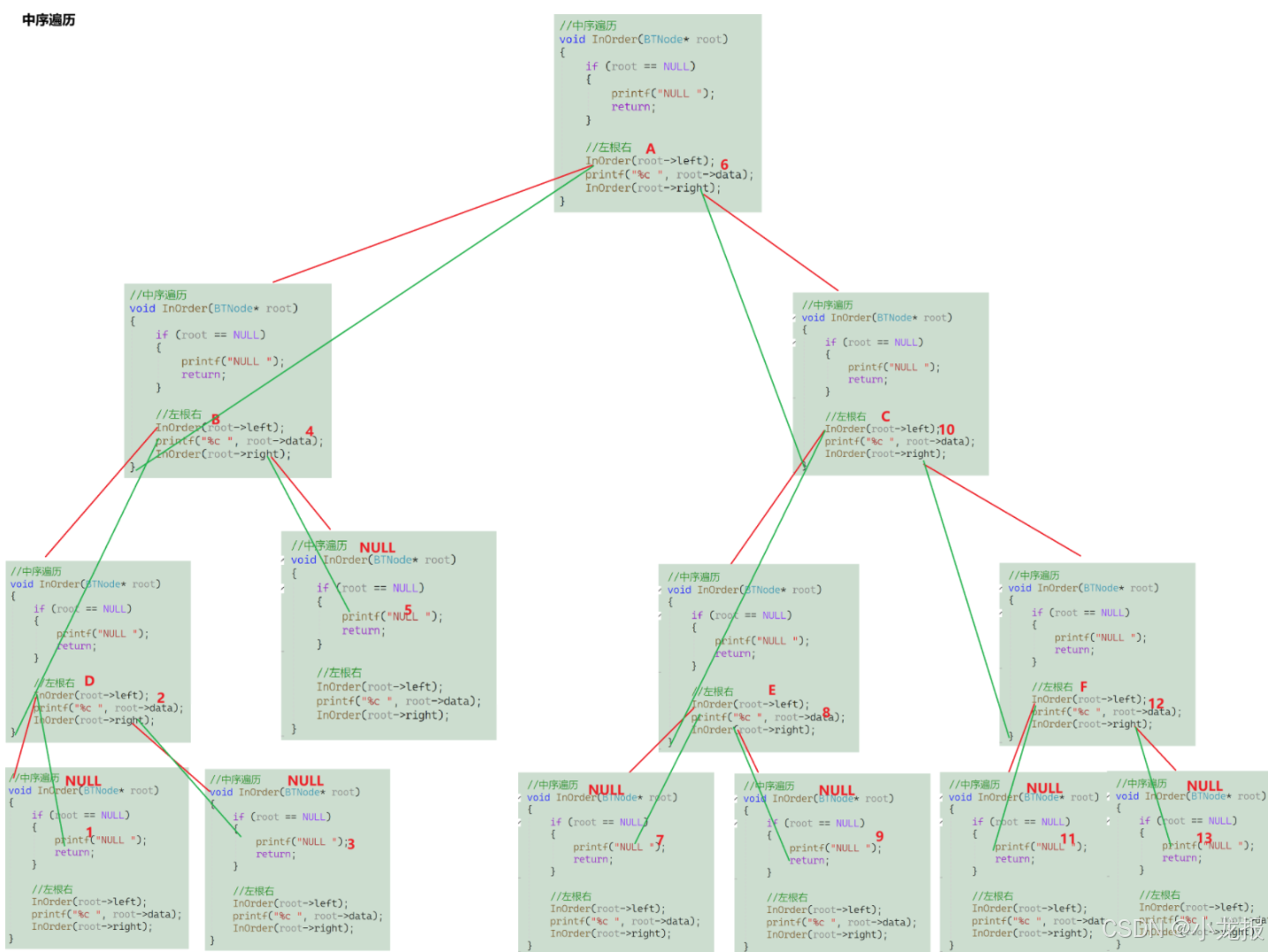 根左右 - 中序遍历 :先遍历左子树,再遍历根节点,最后遍历右子树----