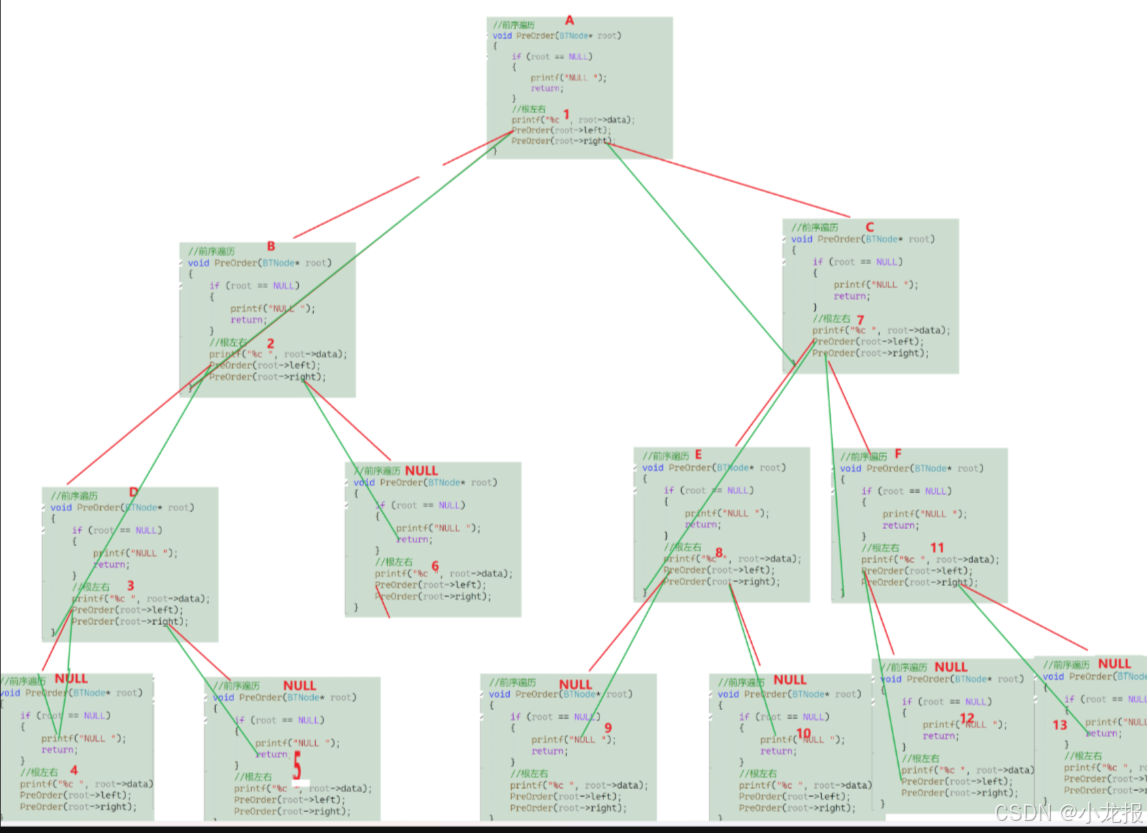 - 前序遍历(先根遍历) :先遍历根节点,再遍历左子树,最后遍历右子树----