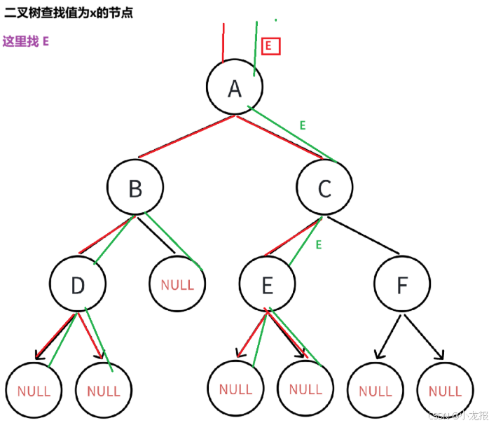 递归查找,找到了就返回当前节点,如果是在左子树中找到就直接返回,没找到继续来到右子树找,最好都没找到就返回NULL