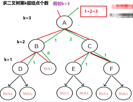 公式 :二叉树第k层节点个数=左子树第k-1层节点个数+右子树第k-1层节点个数