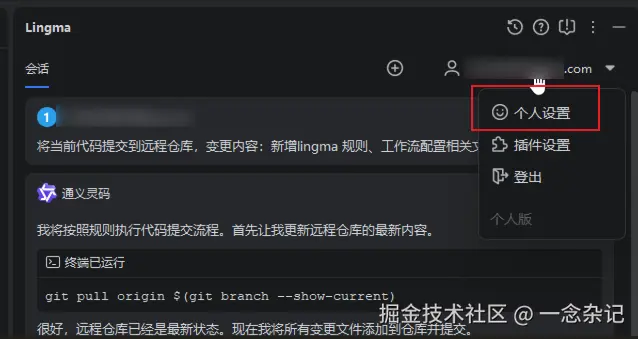 在lingma会话窗口,个人信息处点击,选择"个人设置"选项,点击后会打开一个本地配置的网页。