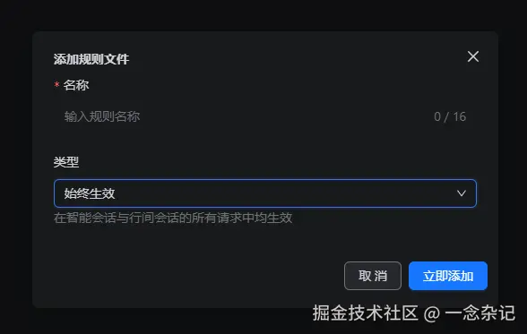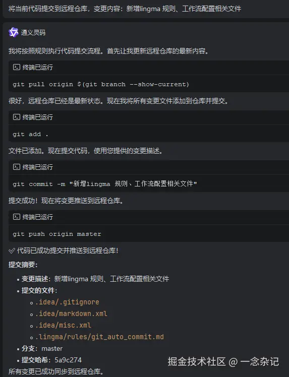 虽然在新版的lingma插件中我们并不能直接找到工作流相关的配置,但完全是可以利用"规则"来实现工作流效果的,比如我这里简单以日常开发中常用的git操作为例: