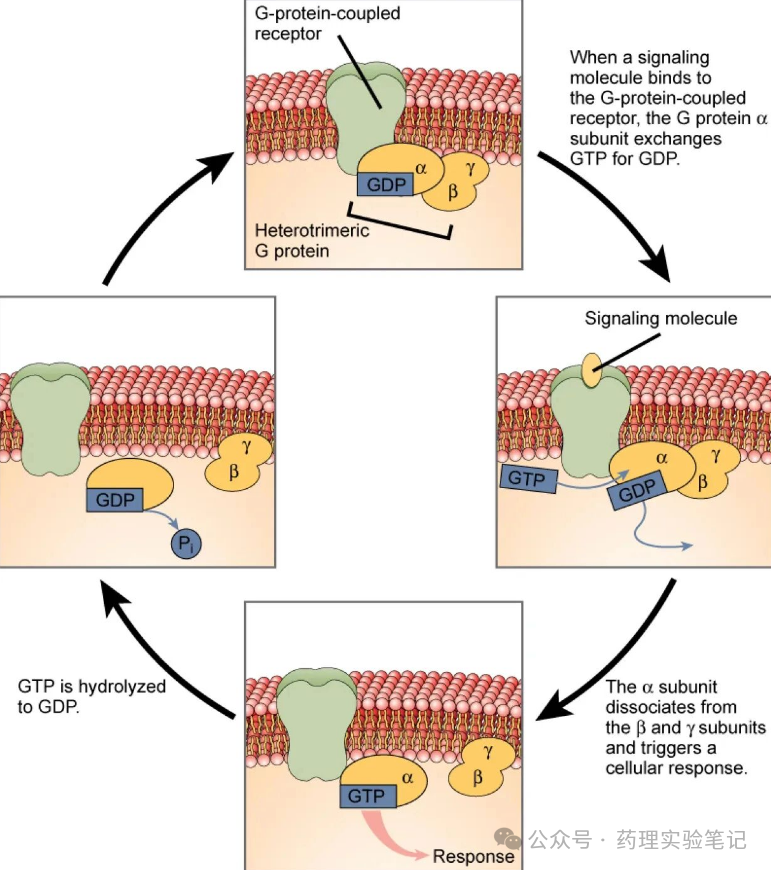 人体内规模最大、功能最丰富的受体家族。当外源信号分子与受体结合后,会触发受体构象改变,激活胞内偶联的 G 蛋白;G 蛋白 α 亚基完成 GDP 与 GTP 的置换后发生解离,激活下游效应因子,启动胞内信号级联放大反应;后续 α 亚基水解 GTP 恢复初始状态,通路及时终止,避免信号过度激活,介导神经调节、激素应答等多种快速生理反应。