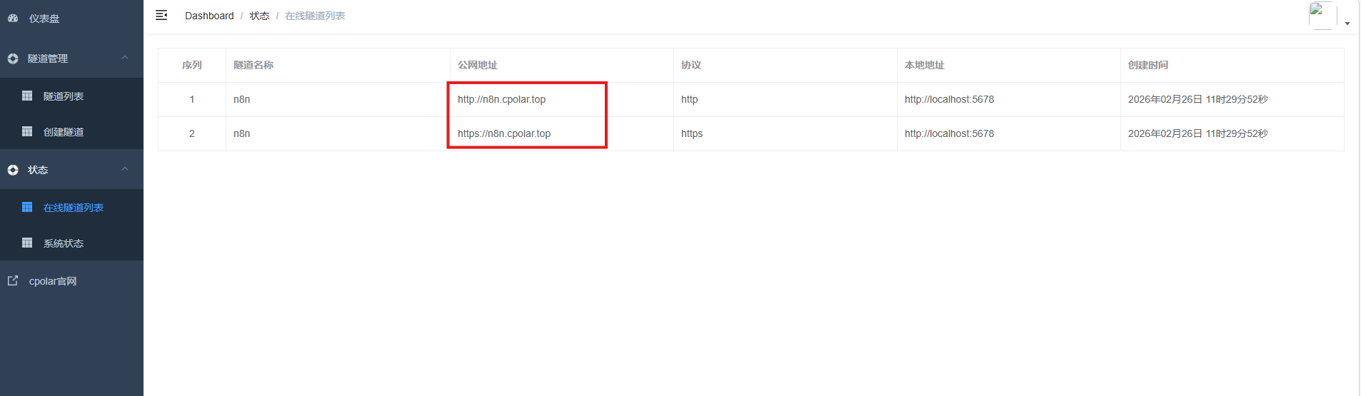 - 隧道名称:可自定义,本例使用了:n8n,注意不要与已有的隧道名称重复