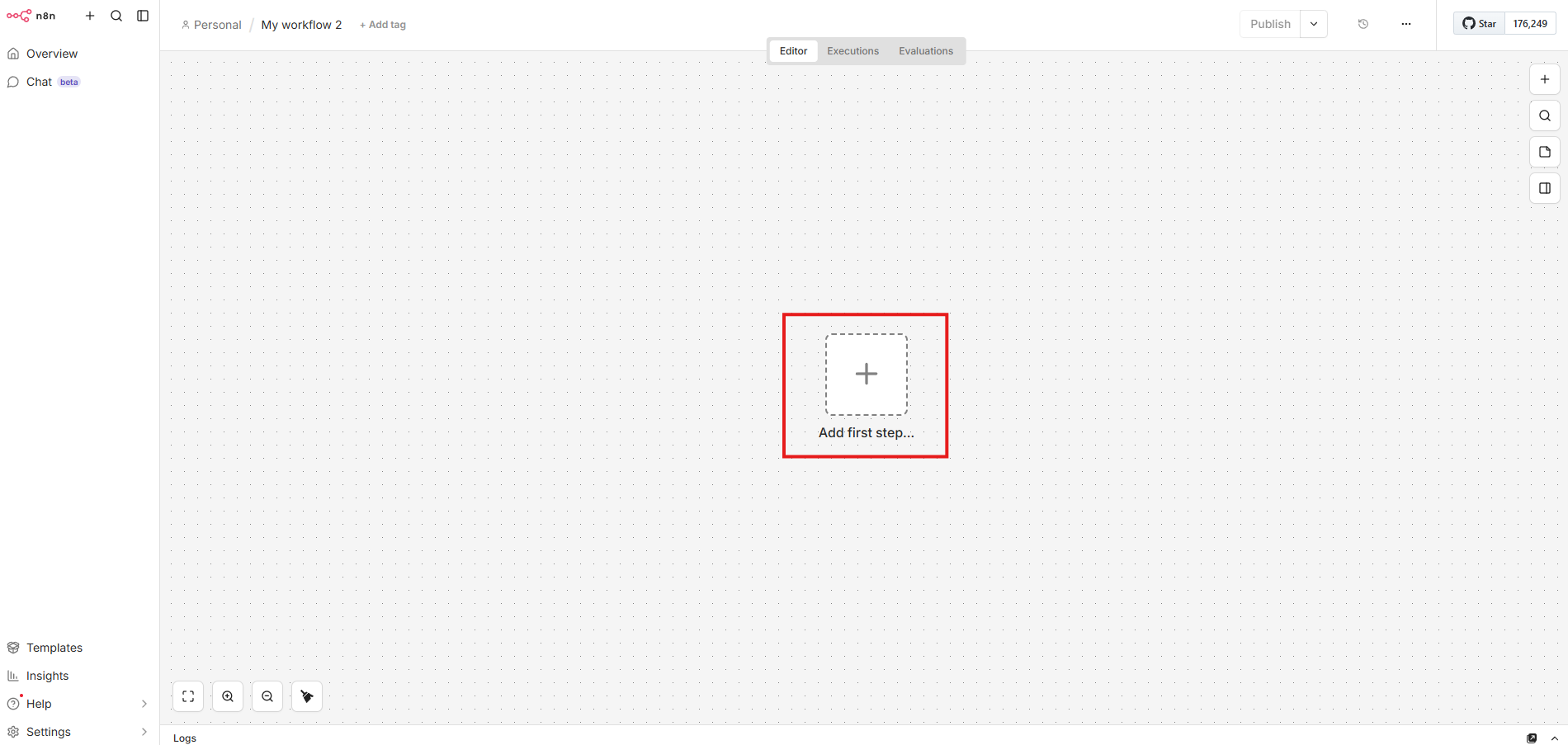 新建工作流在n8n仪表板点击"Create Workflow",添加作为触发器节点: