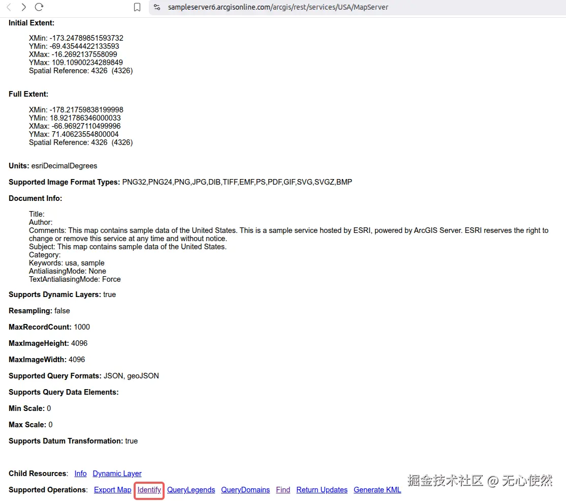 可以看到Supported Operations中有Identify可以判断支持使用identify查询要素