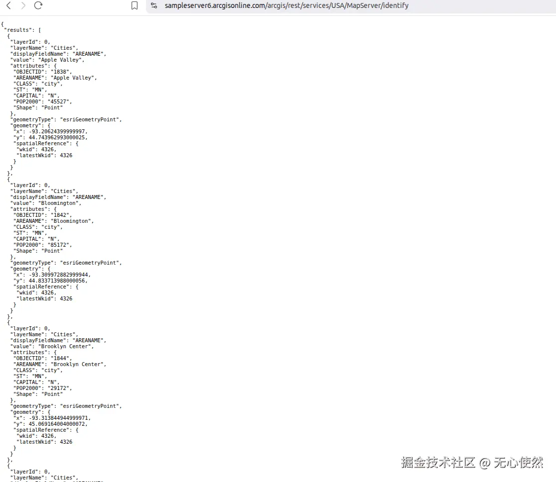 - [1.5 要素识别【地图服务的查询接口(/identify)】](#1.5 要素识别【地图服务的查询接口(/identify)】 "#15-%E8%A6%81%E7%B4%A0%E8%AF%86%E5%88%AB%E5%9C%B0%E5%9B%BE%E6%9C%8D%E5%8A%A1%E7%9A%84%E6%9F%A5%E8%AF%A2%E6%8E%A5%E5%8F%A3identify")