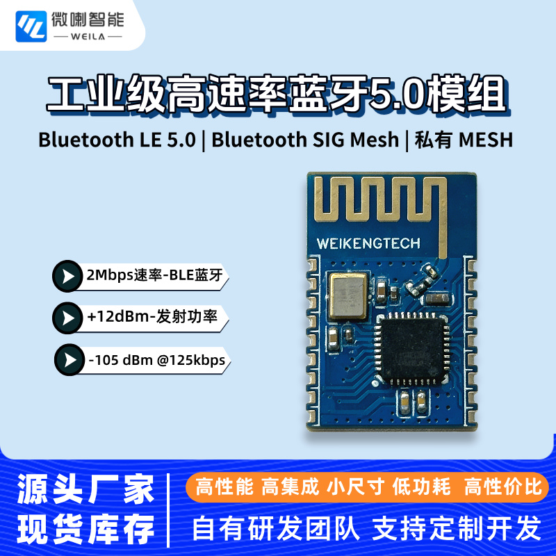 WKB5010(LE5010)是广东微喇智能科技有限公司推出的工业级超低功耗蓝牙 BLE5.0 模组 ,专为智能家居、MESH 组网、智慧出行及 HID 人机设备等无线应用场景打造,以强射频、低功耗、广温域、小尺寸为核心优势,助力客户快速开发高稳定、长续航的智能终端产品。