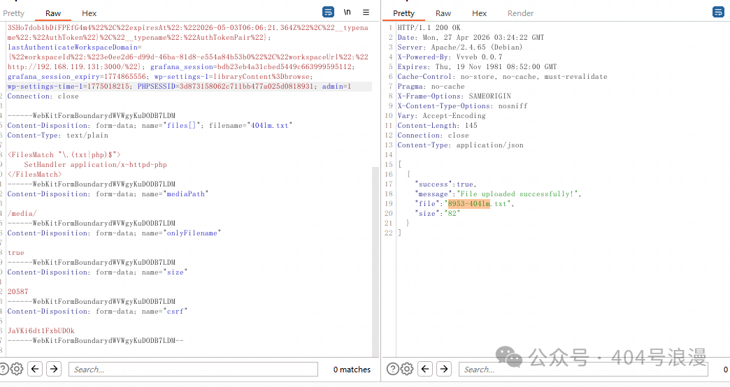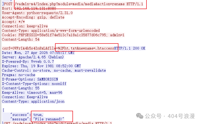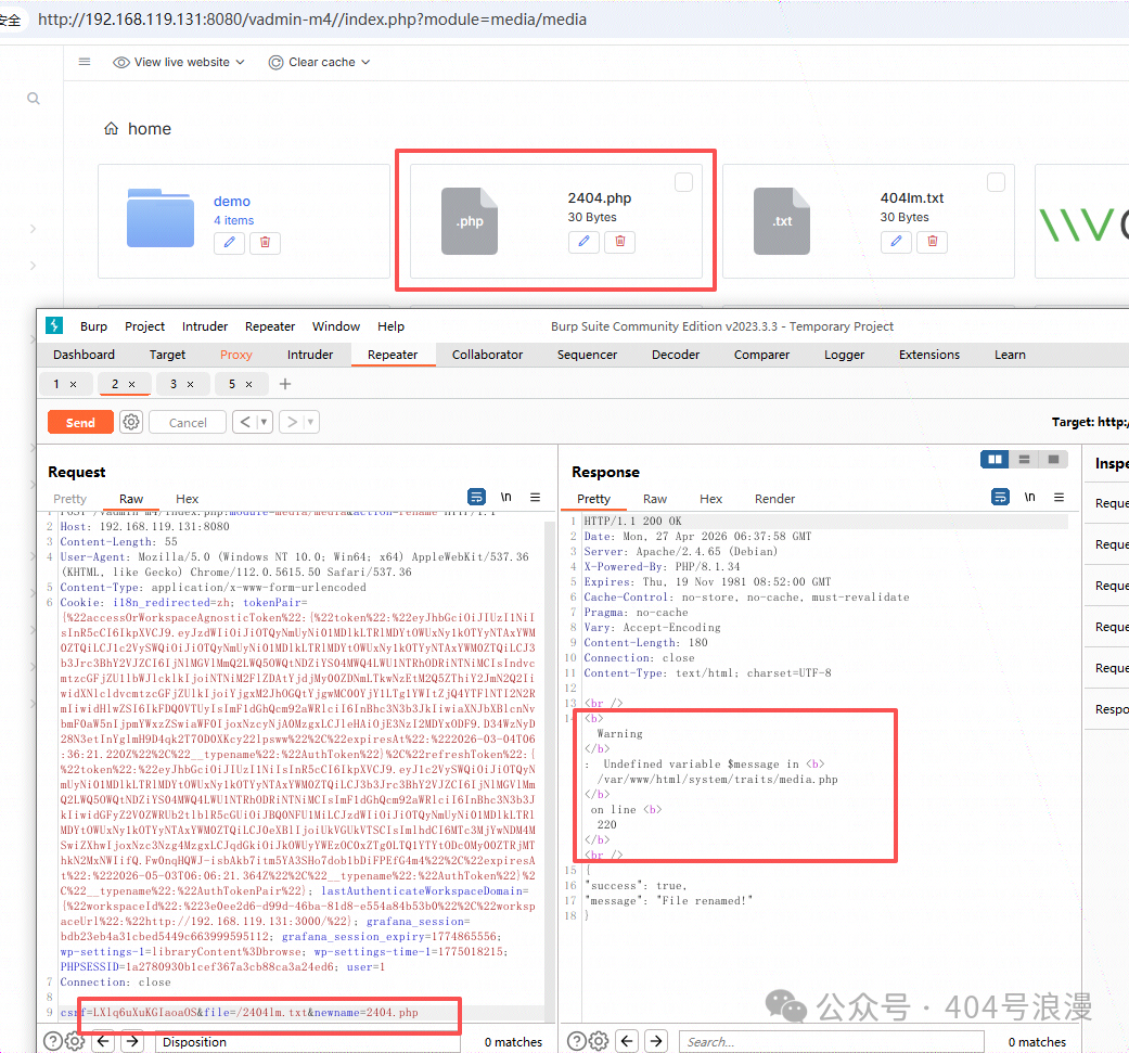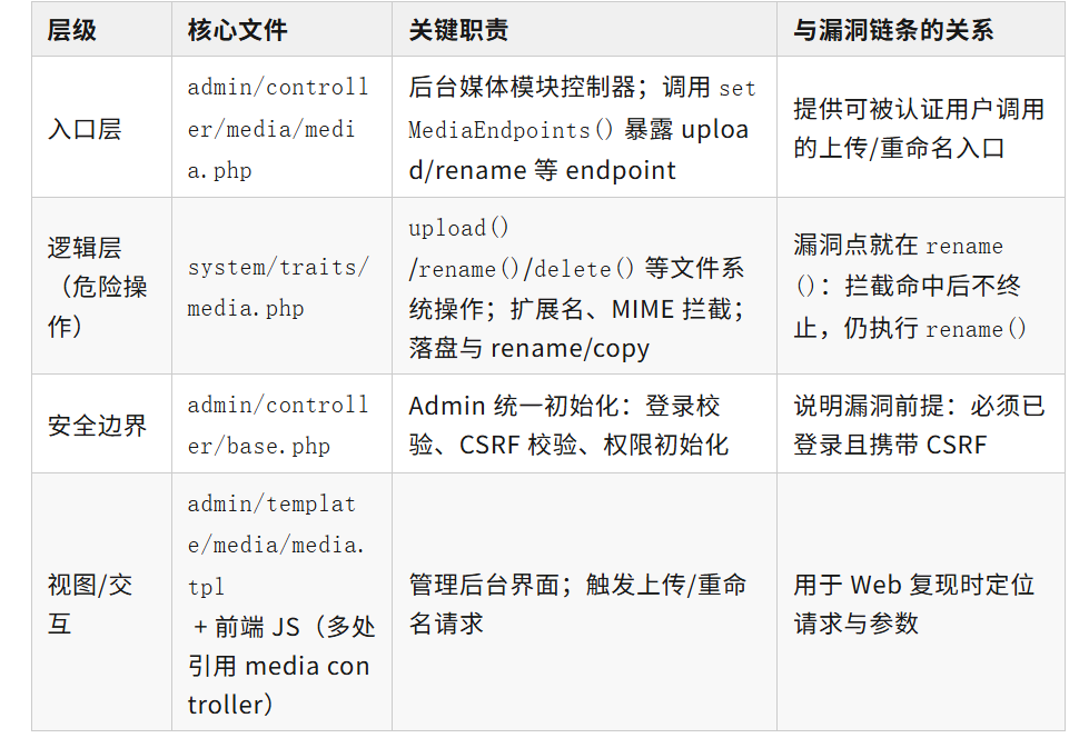 第二段:重命名阶段把上传边界"拆掉"一旦攻击者能把已上传文件重命名,媒体目录就可能出现可执行脚本。