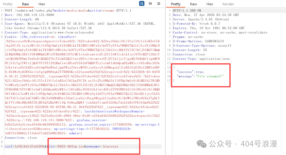 受影响版本中,media.php文件的rename()函数在检测到受限扩展名(如.php、.htaccess)时,仅设置$success=false但缺少return语句,导致验证失败后仍继续执行重命名操作。攻击者可利用此逻辑缺陷先将文本文件重命名为.htaccess注入Apache指令,再将另一文件重命名为.php从而执行任意操作系统命令。
