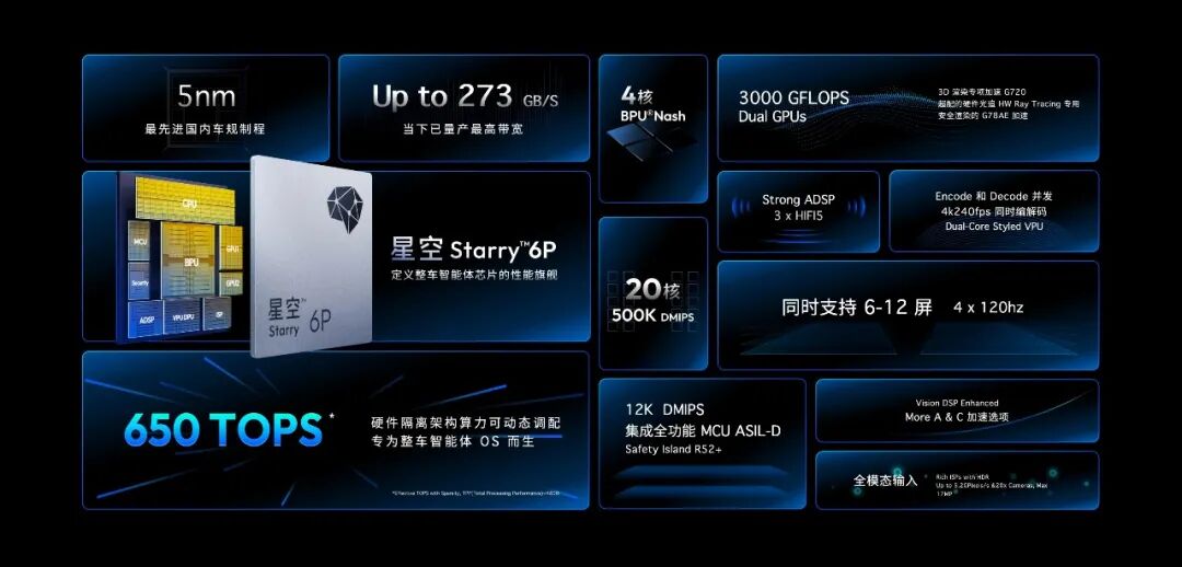 资料显示,星空系列芯片包含星空Starry 6P 和星空Starry 6H两款产品 。其中,星空Starry 6P采用5nm 制程,内置20核 CPU(超过500K DMIPS)、3000GFLOPS 双GPU、4核 BPU Nash,LPDDR5x带宽为273GB/s ,峰值算力达650TOPS ,支持本地运行端侧大模型,能同时支持6~12屏 的显示,以及座舱数字AI及高阶智能辅助驾驶大模型的部署。