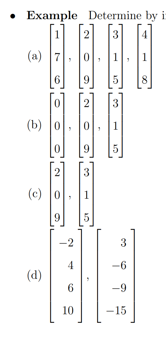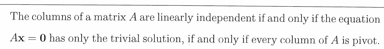 c. linear independent 1.none of them is the multiple of the other or 2.every column is pivot colmun