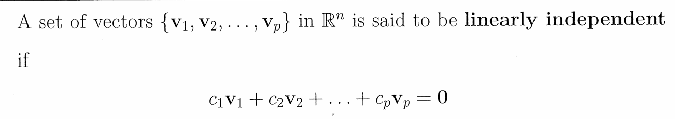 linear independent:所有的c=0 因为向量各部相干,每个人占据一个维度,v3不能让v1 v2通过任何倍数加减形式得到 只有c=0的时候才能实现 也就是说每一个v都应该是基本变量 所以必须每一列都是pivot column