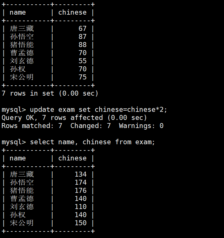 SET chinese = chinese * 2;
