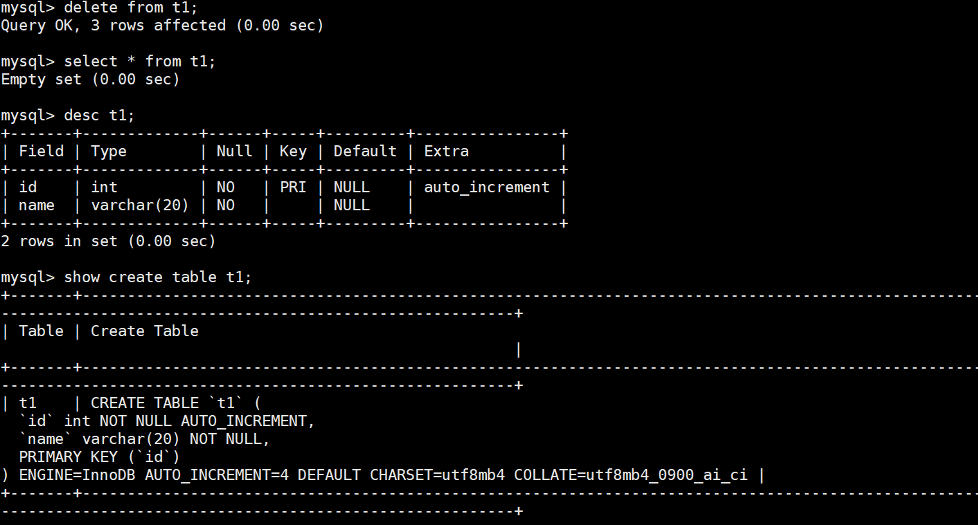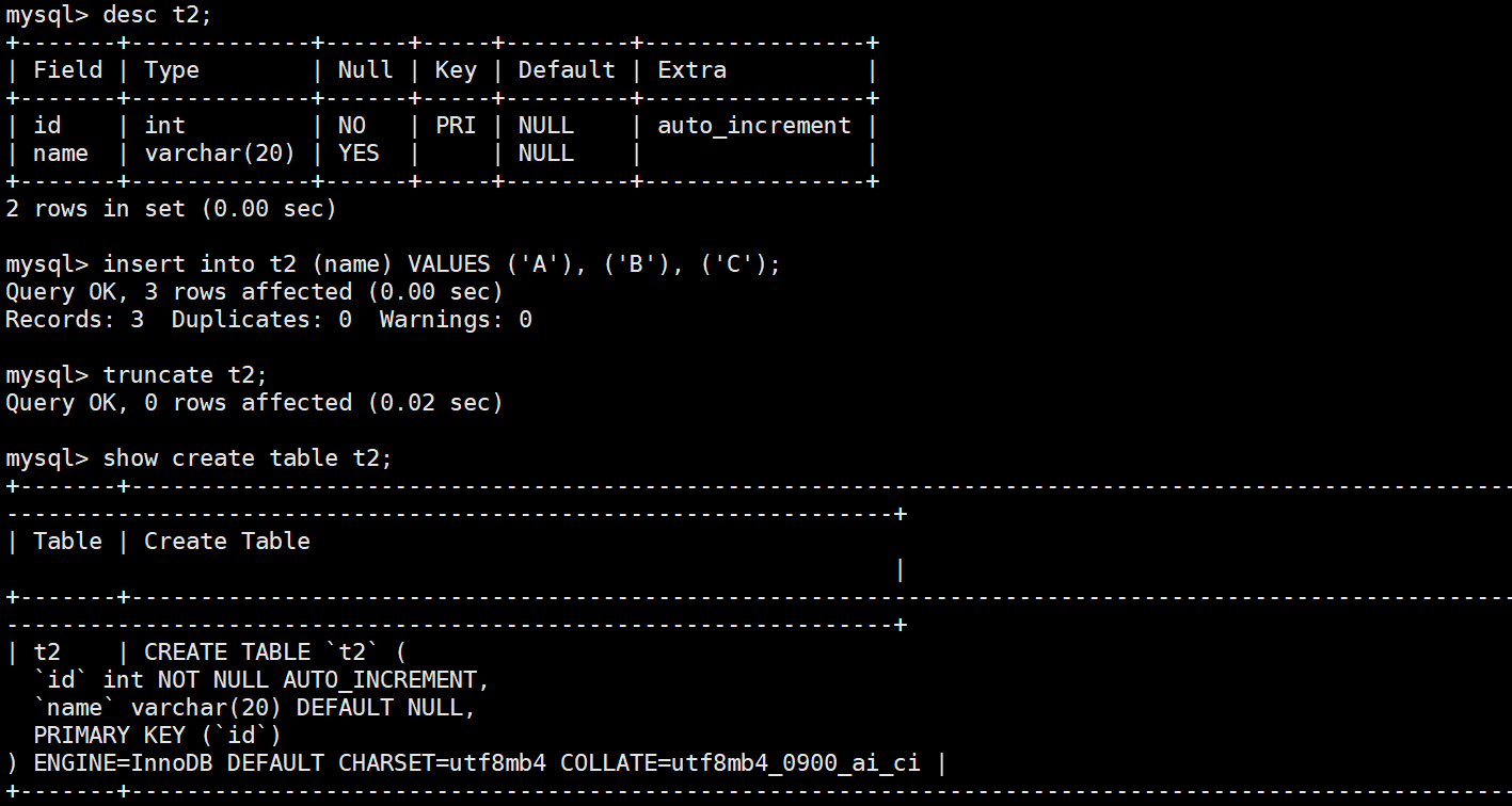 | 是否重置自增 | ❌ 不重置 | ✅ 重置 |
