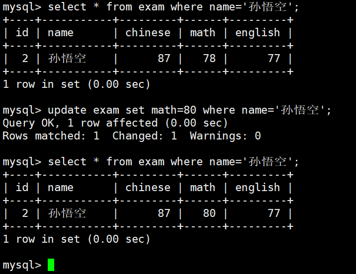 👉 将"孙悟空"的数学成绩改为 80 分