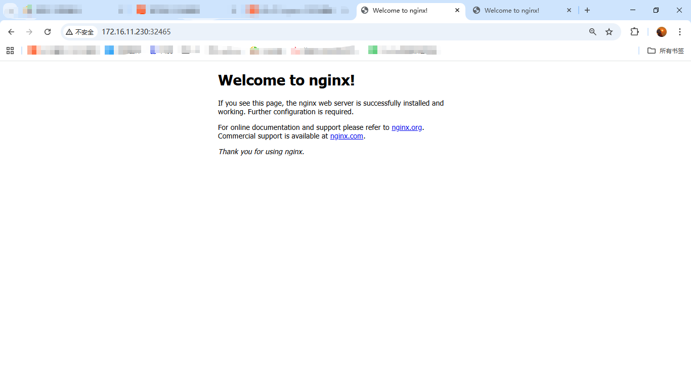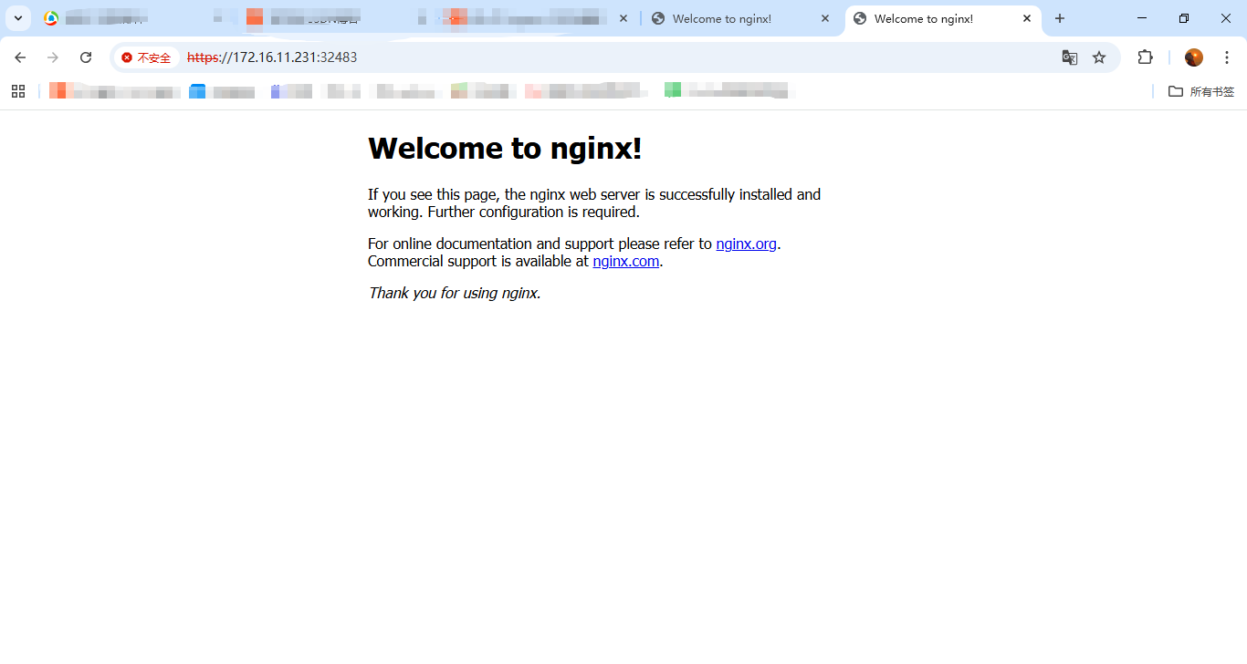 使用ingress-nginx-controller访问方式访问页面:http://172.16.11.230:32465、https://172.16.11.231:32483,可以访问到nginx的主页面就没问题;