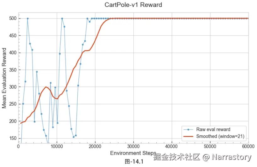 下图展示了 CartPole‑v1 训练过程中输出的奖励曲线。可以看到,虽然整个程序总共执行了 60k 环境步数,但由于使用了多环境并行架构,完成训练只花了不到半分钟------A2C 在时钟效率上的优势不言而喻。另外,相比早先实现的朴素 Actor‑Critic,这套优化的 A2C 模板在稳定性和收敛速度上有了质的飞跃:回报曲线虽然前期比较震荡,波动相比之下就显得非常小,并且能立马收敛,并在大约 200 个回合后就稳定在环境奖励的上限。