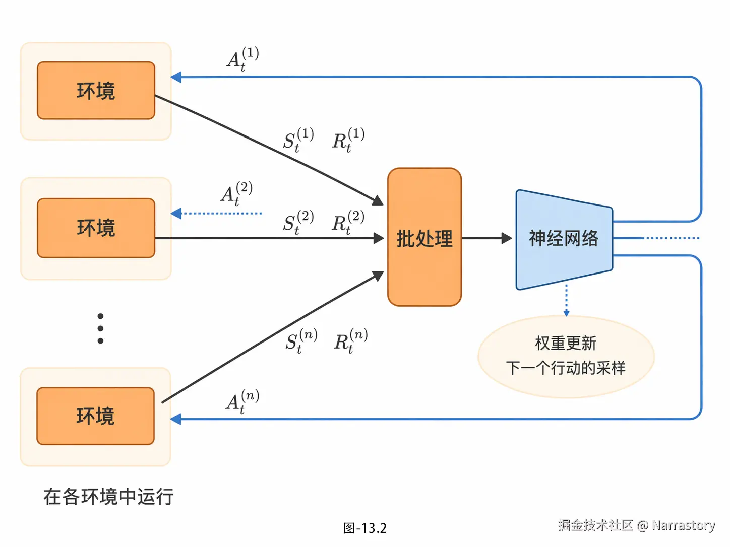 实操起来非常直观:智能代理在各自的环境中独立运行,因此,时刻 <math xmlns="http://www.w3.org/1998/Math/MathML"> t t </math>t 的状态在各个环境中不同。于是我们将时刻 <math xmlns="http://www.w3.org/1998/Math/MathML"> t t </math>t 在各个环境中的状态同步地作为批处理汇总,进行神经网络的训练。此时,从神经网络的输出(策略的概率分布)中对下一个行动进行采样,并将采样后的行动传给各个环境。实验表明,即使A2C采取了同步更新,其性能也不会下降。另外,A2C更易于实现,它可以高效地利用GPU等计算资源。因此,实践中A2C使用得更多。流程图如图13.2所示。