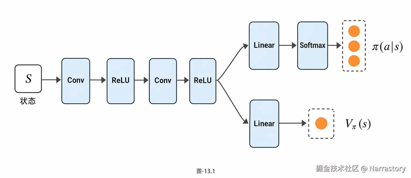 首先我们明确核心定义:共享权重,本质上是让Actor和Critic网络共用一部分底层的特征提取网络,仅在网络的顶层(输出层)进行分流,如图13.1所示,一部分权重用于输出策略 <math xmlns="http://www.w3.org/1998/Math/MathML"> π ( a ∣ s ) \pi(a|s) </math>π(a∣s)(Actor分支),另一部分权重用于输出状态价值 <math xmlns="http://www.w3.org/1998/Math/MathML"> V ( s ) V(s) </math>V(s)(Critic分支)。简单来说,就是"底层同源、顶层分流",而非之前的"从头到尾完全分离"。
