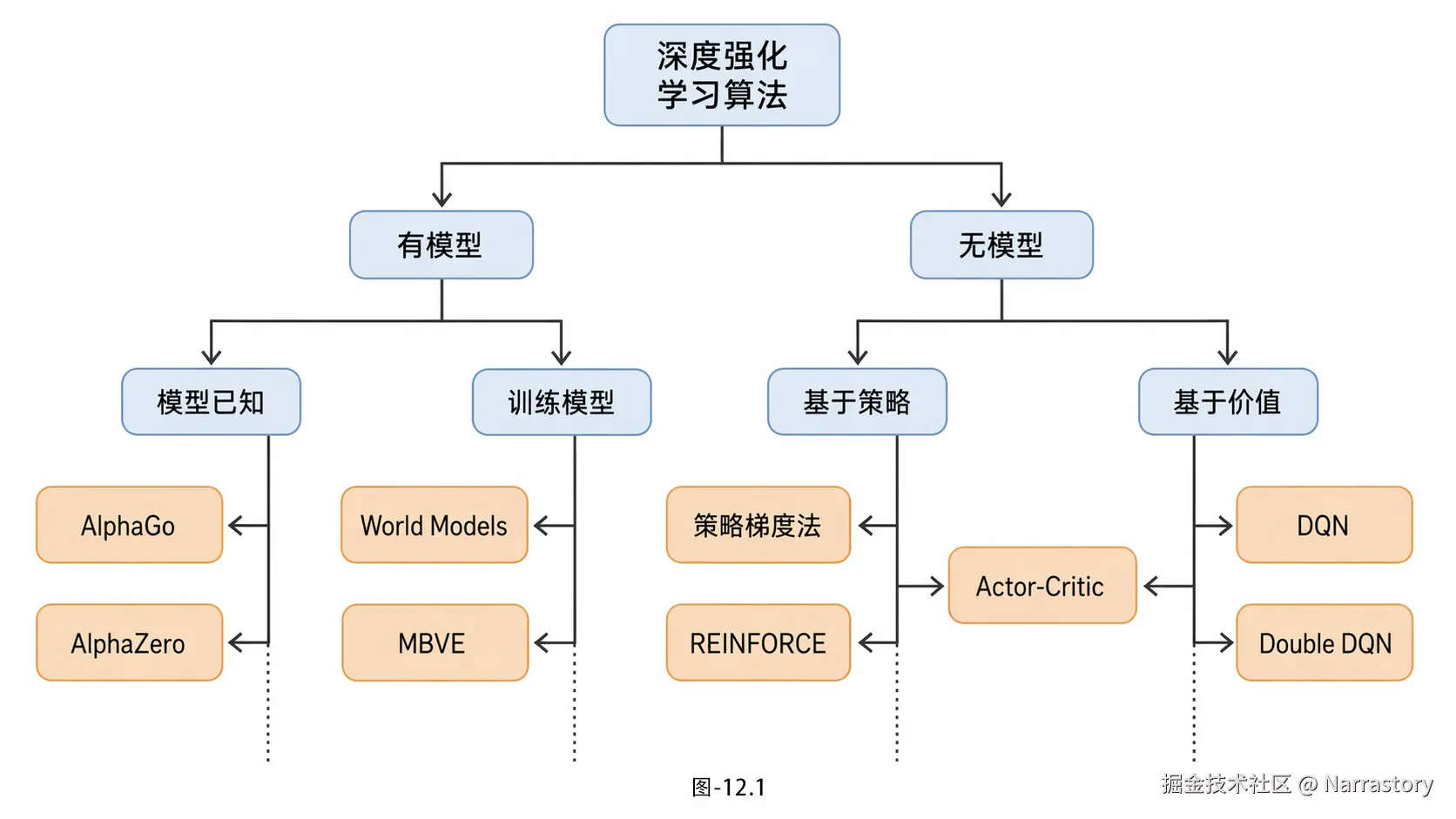至此,到这里我们已经学习了很多强化学习算法了,现在就来对这些强化学习算法归归类。大体分类如图12.1所示。