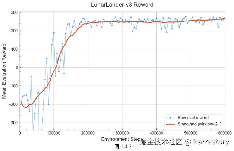 在更具挑战性的 LunarLander‑v3 上,输出的奖励曲线如下图所示。即便总环境步数提升到了 600k,所有运算依然在 2 分钟内便结束了,速度令人满意。更重要的是,整个收敛过程始终非常稳健:平均回报稳步攀升,中途没有出现明显的性能退化或剧烈抖动,并最终稳定在 200 分以上------这通常被视为已成功解决该任务的标志。这组实验再一次印证,这套现代的 A2C 模板能够优雅地扩展到更复杂的控制问题,在保持出色样本效率的同时,也提供了极为可靠的训练稳定性。对于需要快速迭代算法的研究者而言,A2C无疑是一个理想的基础框架。