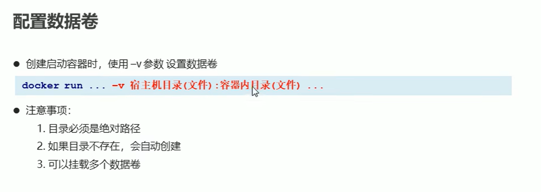 -v :设置容器卷 宿主机目录:容器目录 (目录不存在就会自己创建)