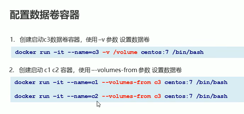 创建c3挂载c1上: docker run -it --name=c3 --volumes-from c1 centos:7