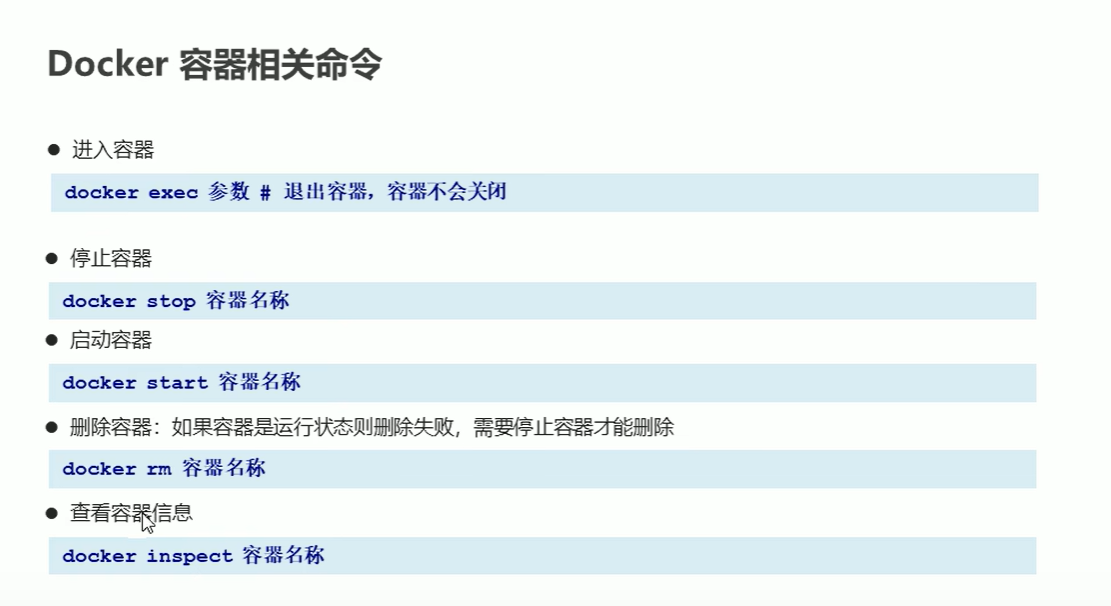 删除容器:docker rm 容器ID/容器名称 (正在运行的容器无法删除)