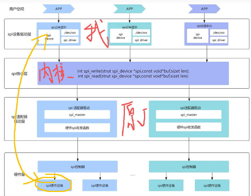 在硬件层我们可以看到存在SPI控制器和SPI外设,而我们一般操作的是外设,所以写的驱动也是外设的驱动,而SPI控制器连接的是SPI适配器的驱动层,这部分驱动是由芯片原厂工程师进行编写的。