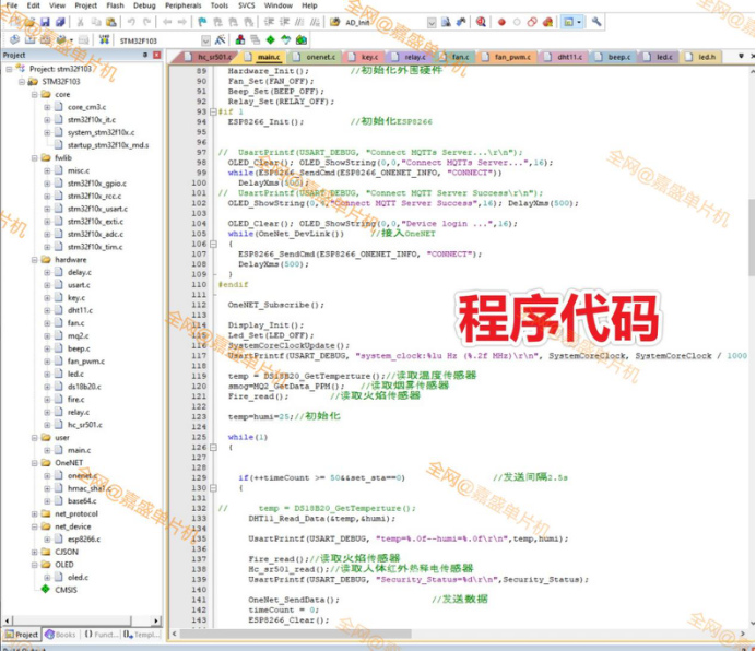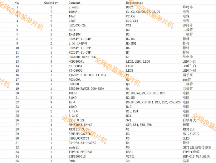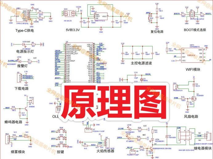 主要硬件设备 STM32F103C8T6 MQ-2烟雾传感器 火焰传感器 ESP-01S OLED显示 继电器 DHT11温湿度