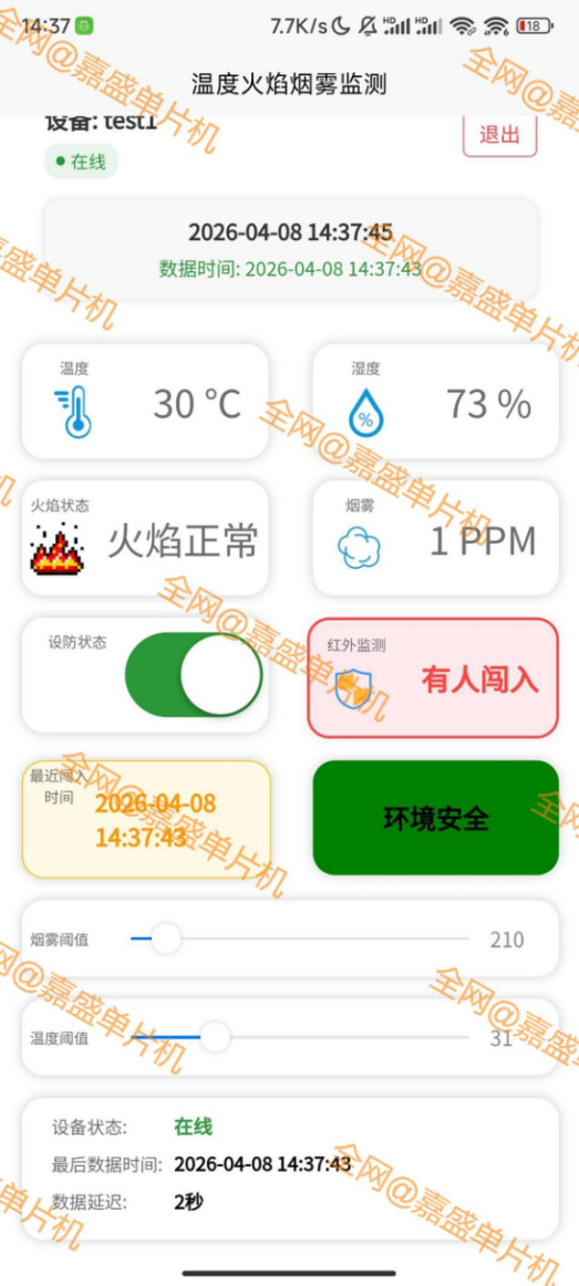 7.通过WIFI模块ESP01S将数据实时上传至物联网云平台,可以通过手机APP查看温湿度、烟雾检测值、火焰状态、设防状态、最近设防后记录的闯入时间和设置烟雾报警阈值,温度报警阈值。