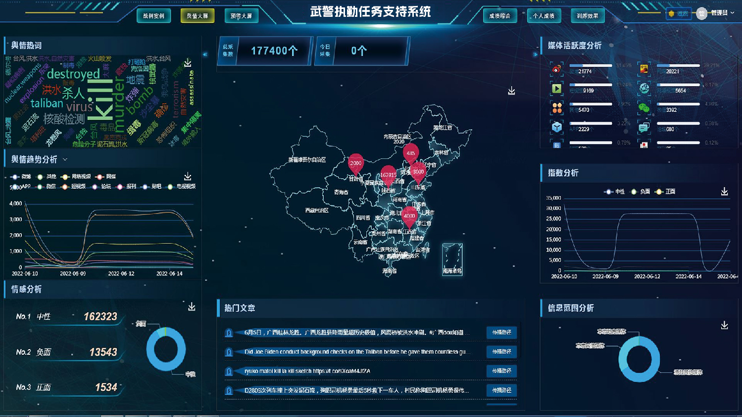基于采集的原始数据,系统完成清洗、加工等预处理,剔除无效信息、规范数据格式。针对执勤成绩数据、舆情数据等核心信息,开展专业化分析并可视化展示,不替代人工决策,仅为执勤部署、策略优化提供精准数据支撑,提升决策科学性。