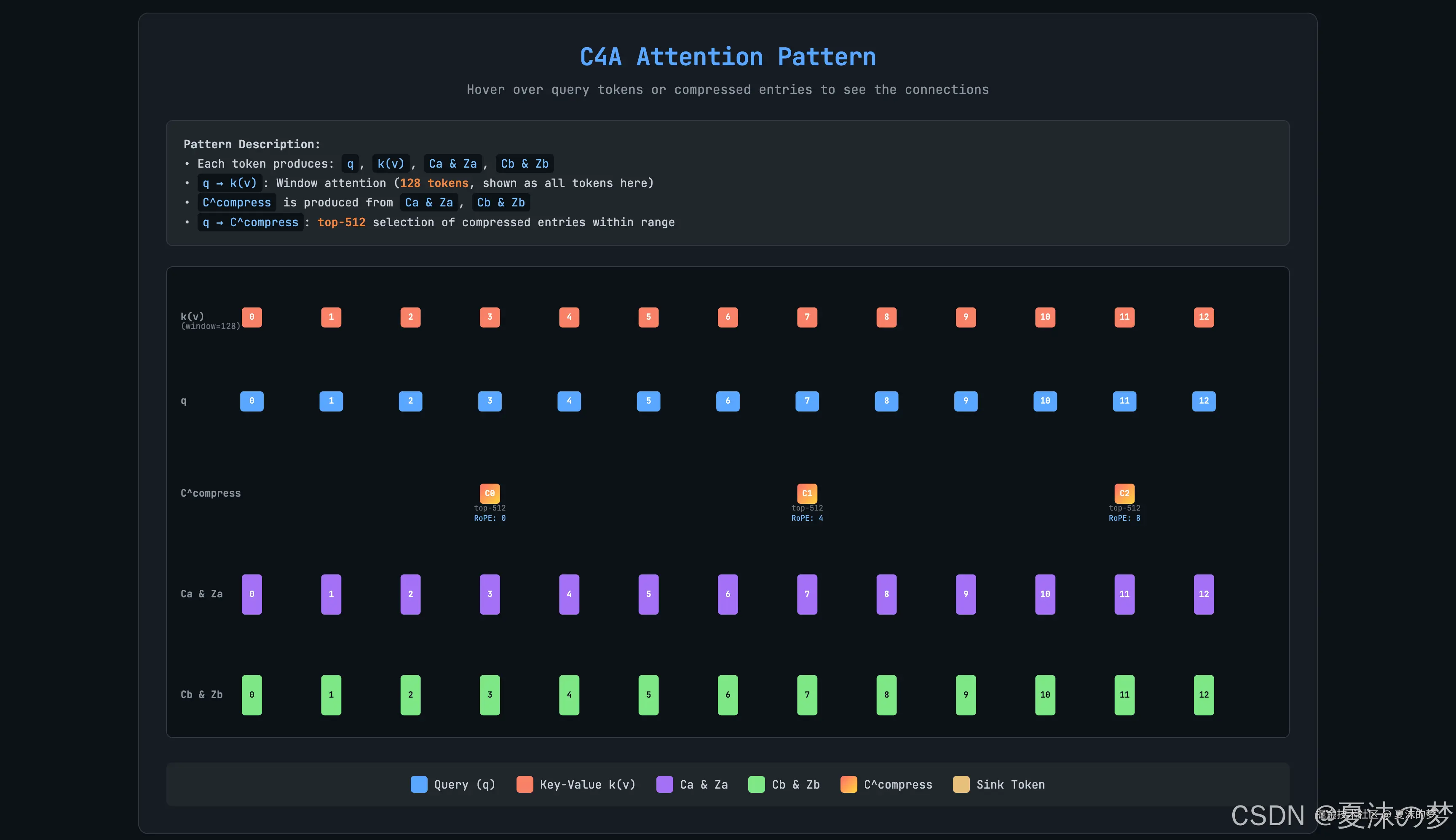 为了更好地说明这种新的注意力机制,以下是处理 13 个令牌的 c4a 注意力动画。有了上述细节,c128a 的情况也应该很容易理解。启动 交互式版本 可以悬停在令牌上检查连接。