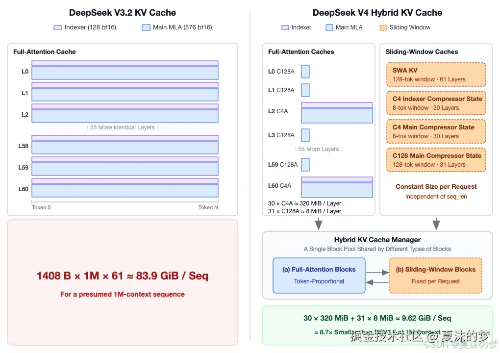 - 跨多个令牌压缩 KV 缓存 (4到128倍内存节省)。在 DeepSeek V4 中,有两种压缩方式: