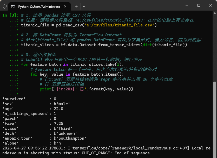 python# 1. 使用 pandas 读取 CSV 文件 # 注意:请确保文件路径 'e:/csvfiles/titanic_file.csv' 在你的电脑上真实存在 titanic_file = pd.read_csv('e:/csvfiles/titanic_file.csv') # 2. 将 DataFrame 转换为 TensorFlow Dataset # dict(titanic_file) 将 pandas DataFrame 转换为字典形式,键为列名,值为列数据 titanic_slices = tf.data.Dataset.from_tensor_slices(dict(titanic_file)) # 3. 遍历数据集 # take(1) 表示只取出一个批次(即第一行数据)进行演示 for feature_batch in titanic_slices.take(1): # feature_batch 是一个字典,包含当前行所有特征的键值对 for key, value in feature_batch.items(): # {!r:20s} 表示将键转换为 repr 字符串并占用 20 个字符宽度 # {} 表示直接打印值 print('{!r:20s}: {}'.format(key, value))