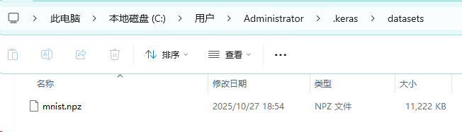 C:\Users\Administrator\.keras\datasets。文件夹中包含一个名为mnist.npz的文件(约11MB),这是著名的MNIST手写数字数据集的压缩格式。当代码调用keras.datasets.mnist.load_data()时,系统会优先在此处查找,若文件存在则直接加载,无需重新从网络下载,从而提升效率。