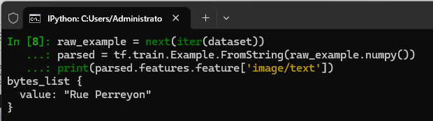 dataset中提取了一条原始 TFRecord 样本,并将其从序列化字符串反序列化为Example对象。随后,它访问并打印了其中名为'image/text'的特征。输出结果显示该样本的文本标签为 "Rue Perreyon",这通常对应于 FSNS 数据集中街景图像上的路名文本。