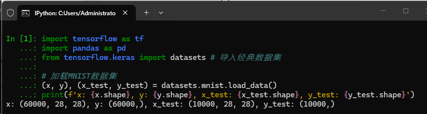 pythonimport tensorflow as tf import pandas as pd from tensorflow.keras import datasets # 导入经典数据集 # 加载MNIST数据集 (x, y), (x_test, y_test) = datasets.mnist.load_data() print(f'x: {x.shape}, y: {y.shape}, x_test: {x_test.shape}, y_test: {y_test.shape}')