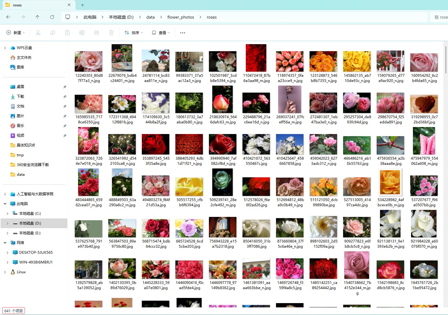 pythonimport random import pathlib data_path = pathlib.Path('d:/data/flower_photos') all_image_paths = list(data_path.glob('*/*')) all_image_paths = [str(path) for path in all_image_paths] random.shuffle(all_image_paths) # 打散数据 image_count = len(all_image_paths) print(f'图片总数:{image_count}') print('10张图片路径:') for path in all_image_paths[:10]: print(path)