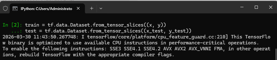 tf.data.Dataset.from_tensor_slices将 NumPy 数组形式的训练数据(x, y)和测试数据(x_test, y_test)封装成了 TensorFlow 的 Dataset 对象。这一步构建了高效的输入管道,将数据切片并转化为模型可直接迭代读取的格式,为后续的批量训练与评估做好了准备,而下方的日志仅为 CPU 指令集优化的提示信息。