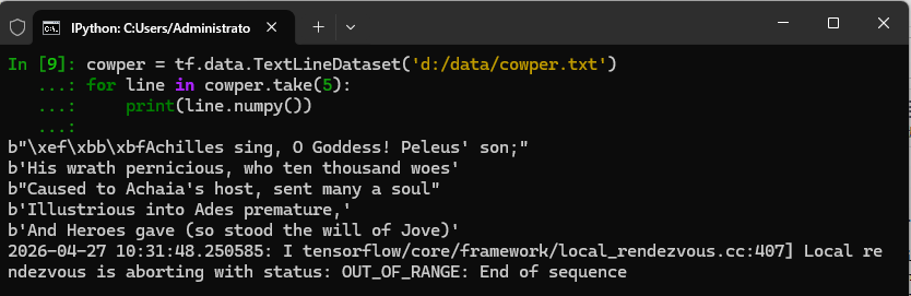 pythoncowper = tf.data.TextLineDataset('d:/data/cowper.txt') for line in cowper.take(5): print(line.numpy())