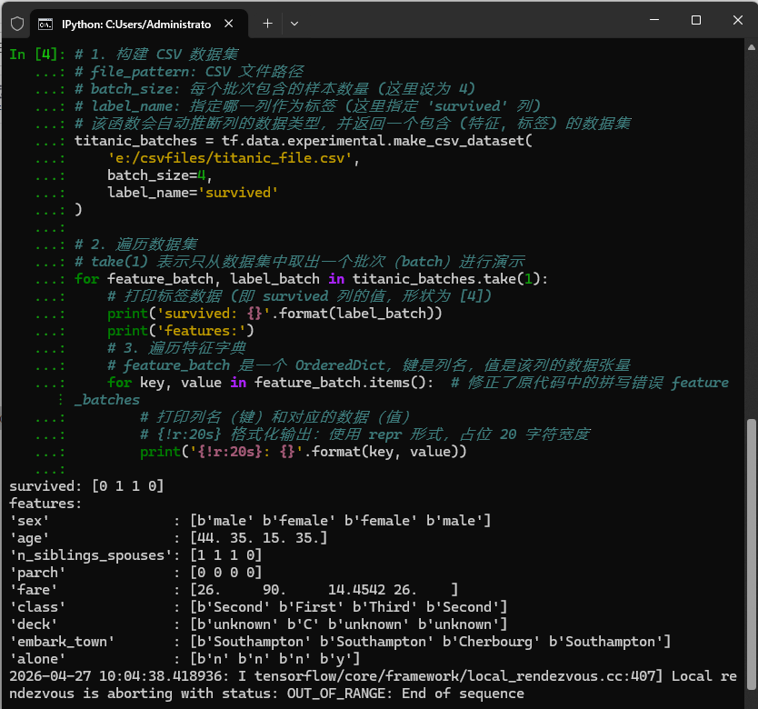 make_csv_dataset从 CSV 文件构建数据集。它成功读取了一个批次(4 个样本)的泰坦尼克号数据,将survived列作为标签,其余列为特征。输出显示了每个特征列的名称及其对应的张量值,包括字符串和数值类型,验证了数据加载和预处理流程的正确性。