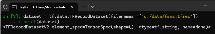 tf.data.TFRecordDataset从指定路径(d:/data/fsns.tfrec)加载 TFRecord 文件,创建了一个 TensorFlow 数据集对象。打印结果显示该数据集的元素类型为标量字符串(TensorSpec(shape=(), dtype=tf.string)),表明数据以序列化的字符串形式存储,后续需要解析才能获取具体特征。